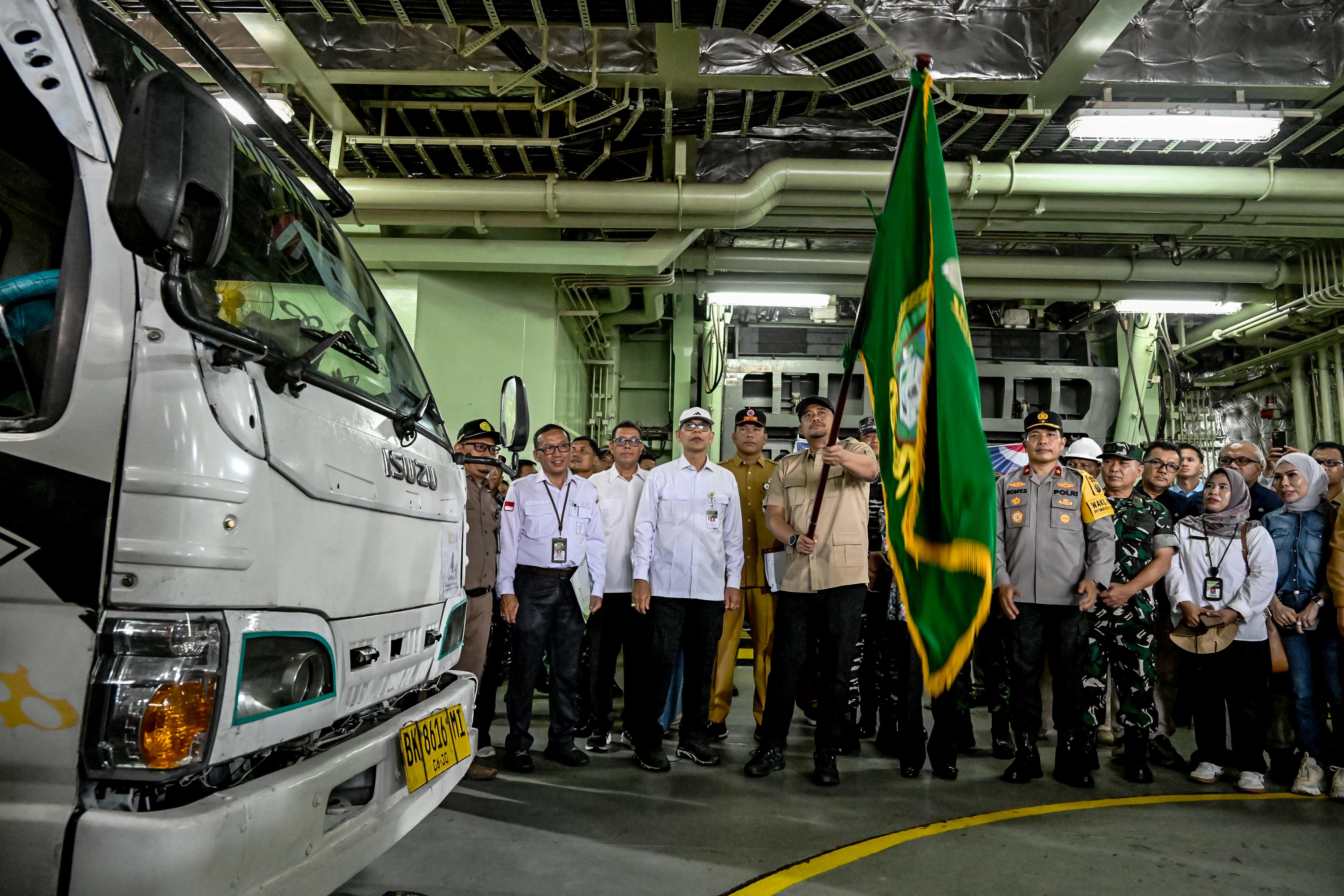 Bantuan secara simbolis diserahkan oleh Staf Ahli Bidang Infrastruktur Pertanian Kementan Ali Jamil kepada Gubernur Bobby Nasution di atas KRI Banda Aceh 593-1. Sebanyak 25 truk disiapkan untuk mengangkut bantuan logistik berupa sosis, mi instan, minyak goreng, susu, gula, pampers, pembalut, air mineral, beras, biskuit, sarung, teh, sandal, sabun, odol dan sikat gigi, kopi, pakaian, hingga selimut.