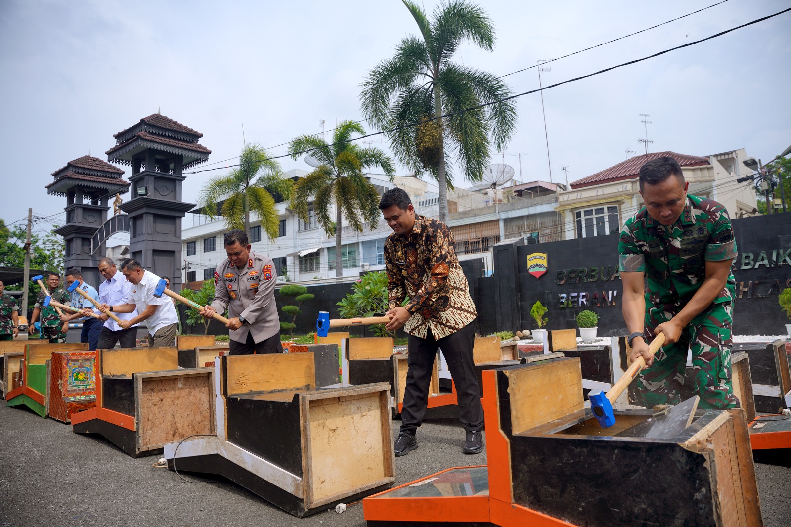 Usai memberikan keterangan, Gubernur Sumut, Pangdam I/BB, Kapolda Sumut, Kabinda Sumut, Kaotmil I Medan, Kajati Sumut, melakukan pemusnahan mesin judi menggunakan palu. Setelah itu dilanjutkan dengan menyaksikan pemusnahan dengan menggunakan alat berat. **(H21DISKOMINFOSUMUT)