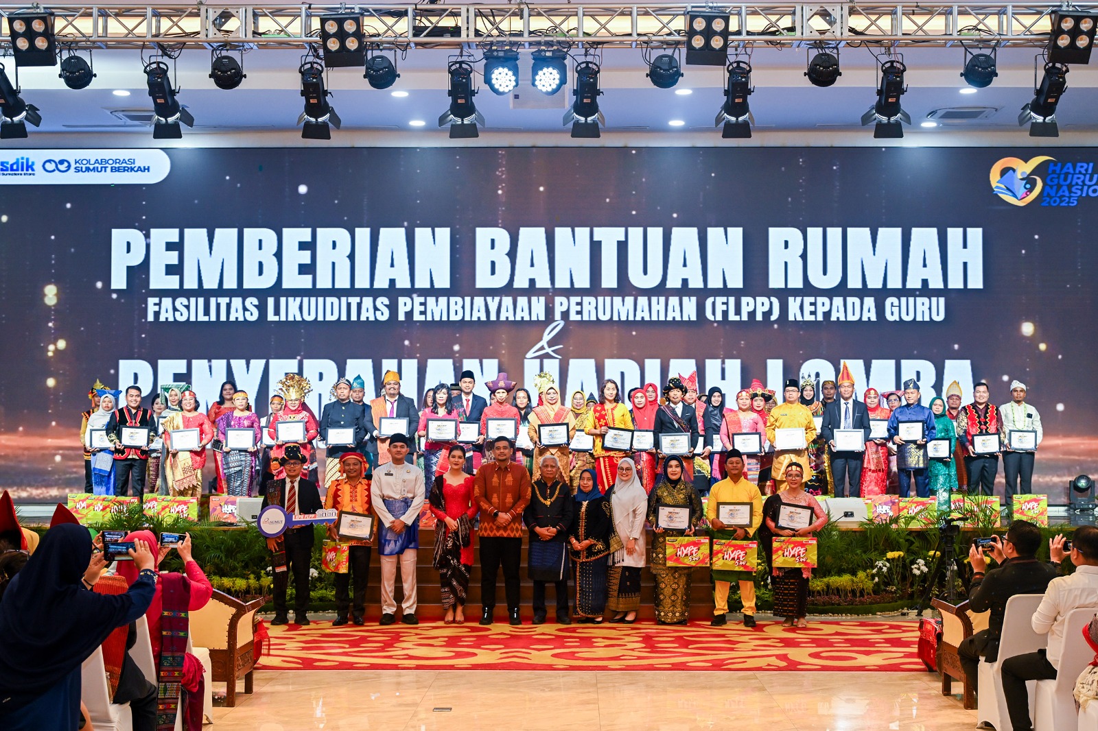 Pada puncak perayaan tersebut juga dilakukan penyerahan hadiah bagi pemenang lomba guru inspiratif, guru inovatif, kepala sekolah transformatif, dan pengawas adaptif. Selain itu, Gubernur Bobby juga menyerahkan bantuan rumah fasilitas likuiditas pembiayaan perumahan (FLPP) kepada guru.