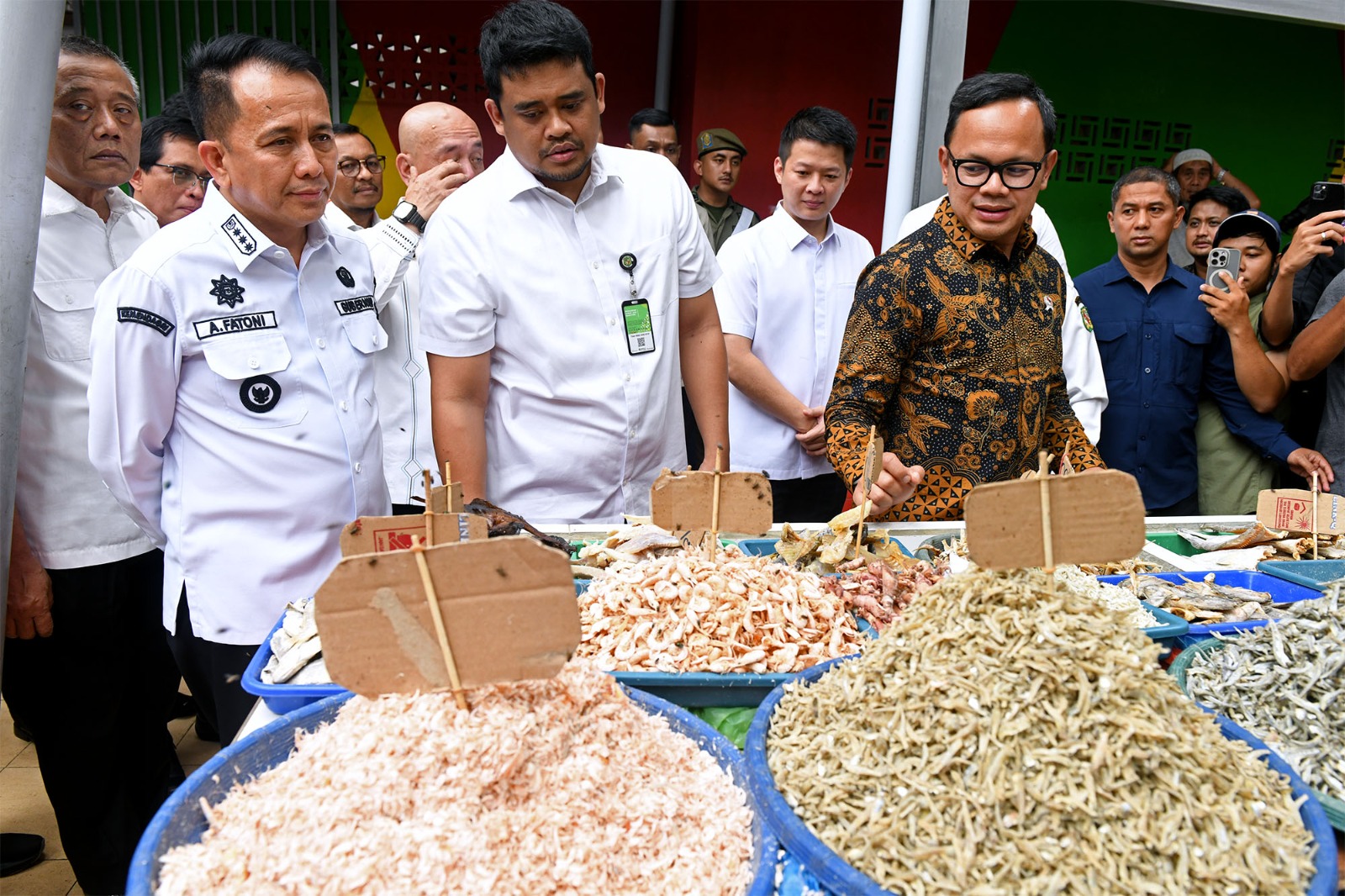 Penjabat (Pj) Gubernur Sumatera Utara (Sumut) Agus Fatoni bersama Wakil Menteri Dalam Negeri (Wamendagri) Bima Arya Sugiarto meninjau pasar, guna memastikan stabilitas harga pangan terjaga jelang Natal dan Tahun Baru 2025. Mereka meninjau Pasar Akik yang berlokasi di Jalan Akik Nomor 5, Medan, Sumut, Rabu (11/12/2024).