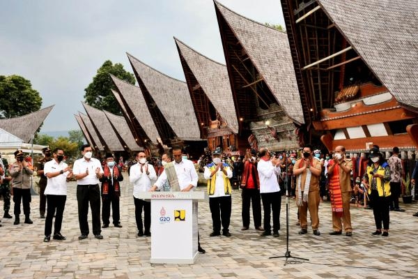 Didampingi Gubernur Sumut Edy Rahmayadi, Menteri Marves Luhut Binsar Panjaitan, Menparekraft Sandiaga Solahuddin Uno dan Menteri PUPR M Basoeki Hadimoeljono, Jokowi resmikan Kampung Ulos melalui penandatanganan Prasasti Penataan Kampung Ulos Huta Raja. Dia berharap penataan Kampung Ulos bisa dikerjakan dengan baik dan benar.