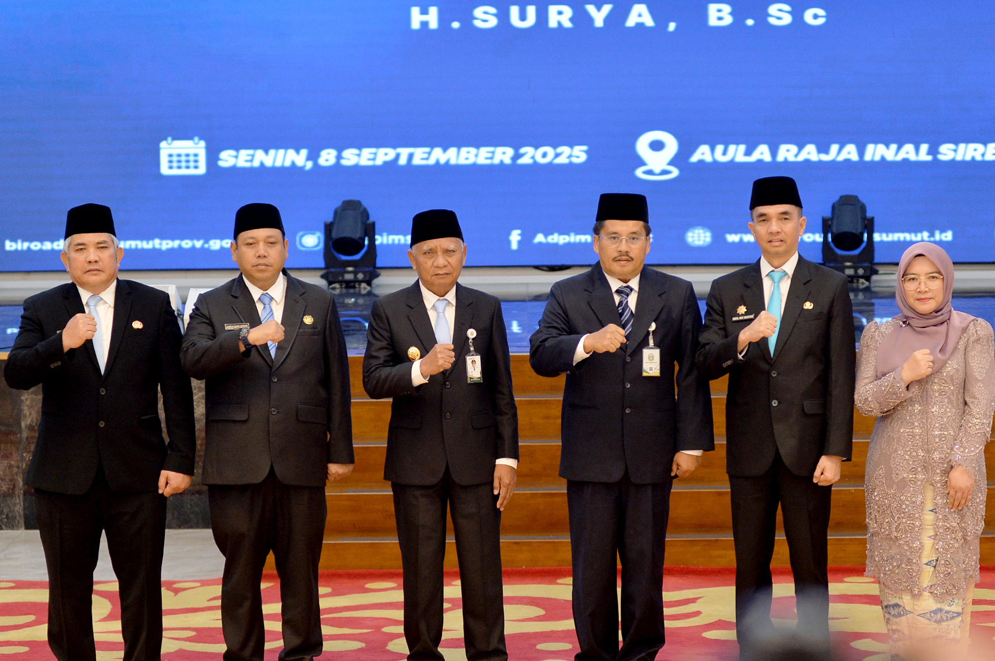Wakil Gubernur (Wagub) Sumatera Utara (Sumut) Surya melantik pejabat pimpinan tinggi pratama dan pejabat administrator di lingkungan Pemerintah Provinsi (Pemprov) Sumut. Acara tersebut berlangsung di Aula Raja Inal Siregar, Kantor Gubernur, Jalan Diponegoro 30, Medan, Senin (8//9/2025).
