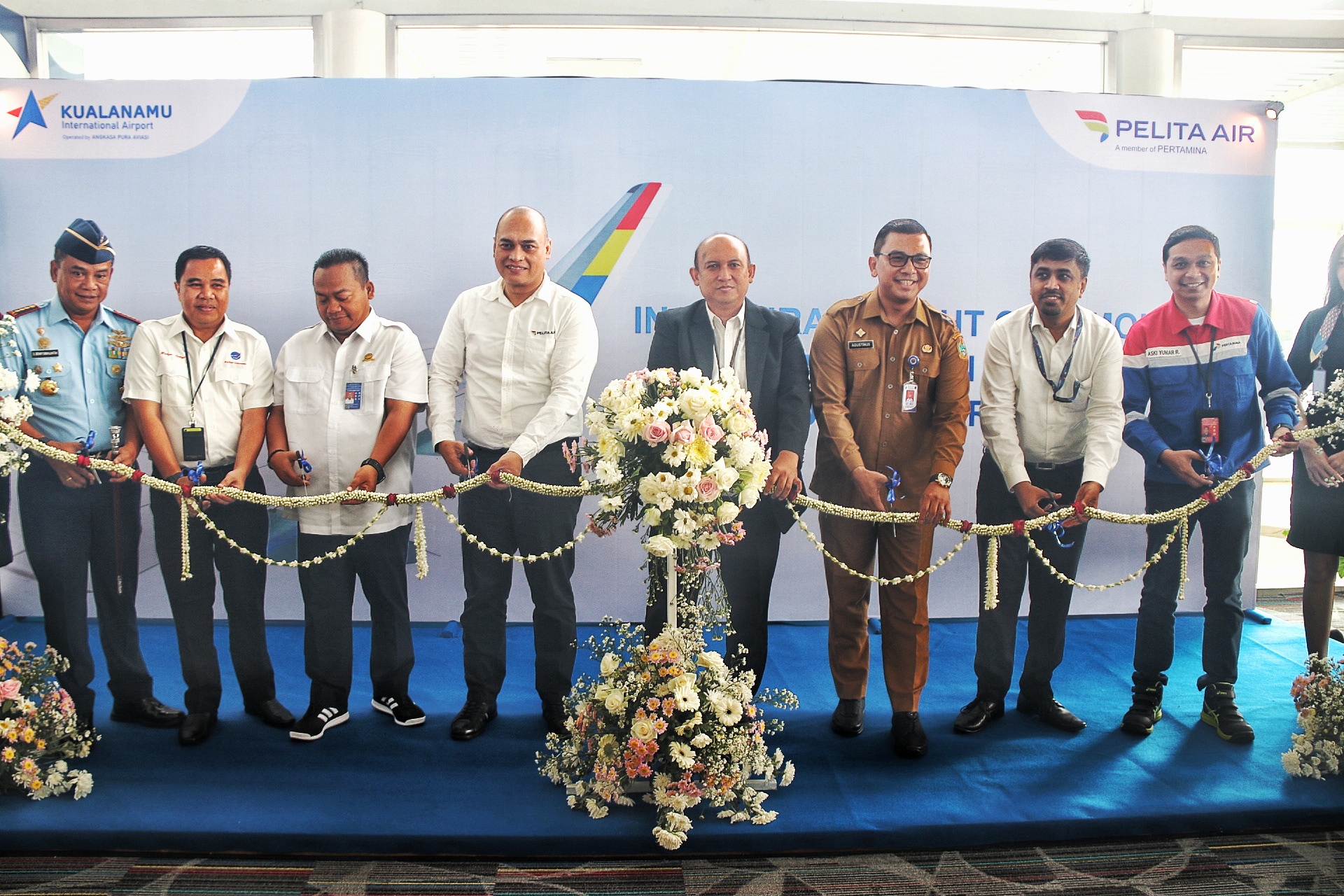 Prosesi seremonial diawali dengan salute water pada saat pesawat Pelita Air mendarat di Bandara Kualanamu. Selanjutnya, peresmian ditandai dengan pemotongan pita bunga.**(H17/DISKOMINFO SUMUT)