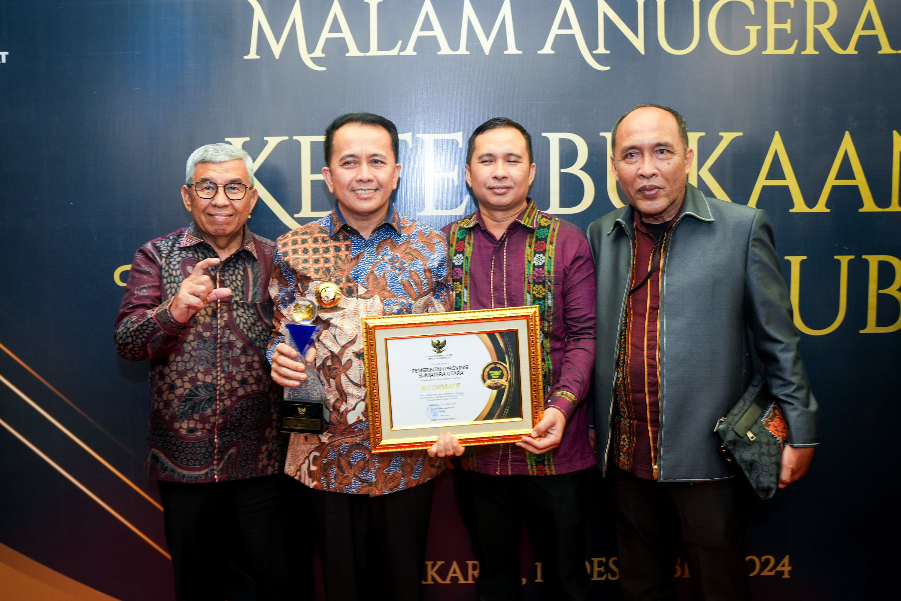 Pemerintah Provinsi Sumatera Utara (Sumut) meraih Anugerah Keterbukaan Informasi Publik tahun 2024 kualifikasi Informatif. Penjabat (Pj) Gubernur Sumatera Utara (Sumut) Agus Fatoni menerima langsung penghargaan tersebut pada acara Malam Anugerah Keterbukaan Informasi Publik Tahun 2024 yang berlangsung di Jakarta, Selasa (17/12/2024).