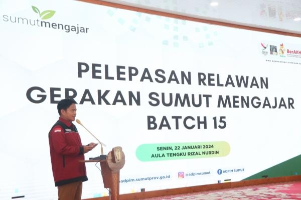 Penjabat (Pj) Gubernur Sumatera Utara (Sumut) Hassanudin melepas ratusan relawan Gerakan Sumut Mengajar Batch 15 di Aula Tengku Rizal Nurdin, Rumah Dinas Gubernur, Jalan Jenderal Sudirman Nomor 41 Medan, Senin (22/1) pagi. Hassanudin berpesan agar para relawan dapat bersungguh-sungguh memberikan pengabdian, menjaga sikap dan perilaku.