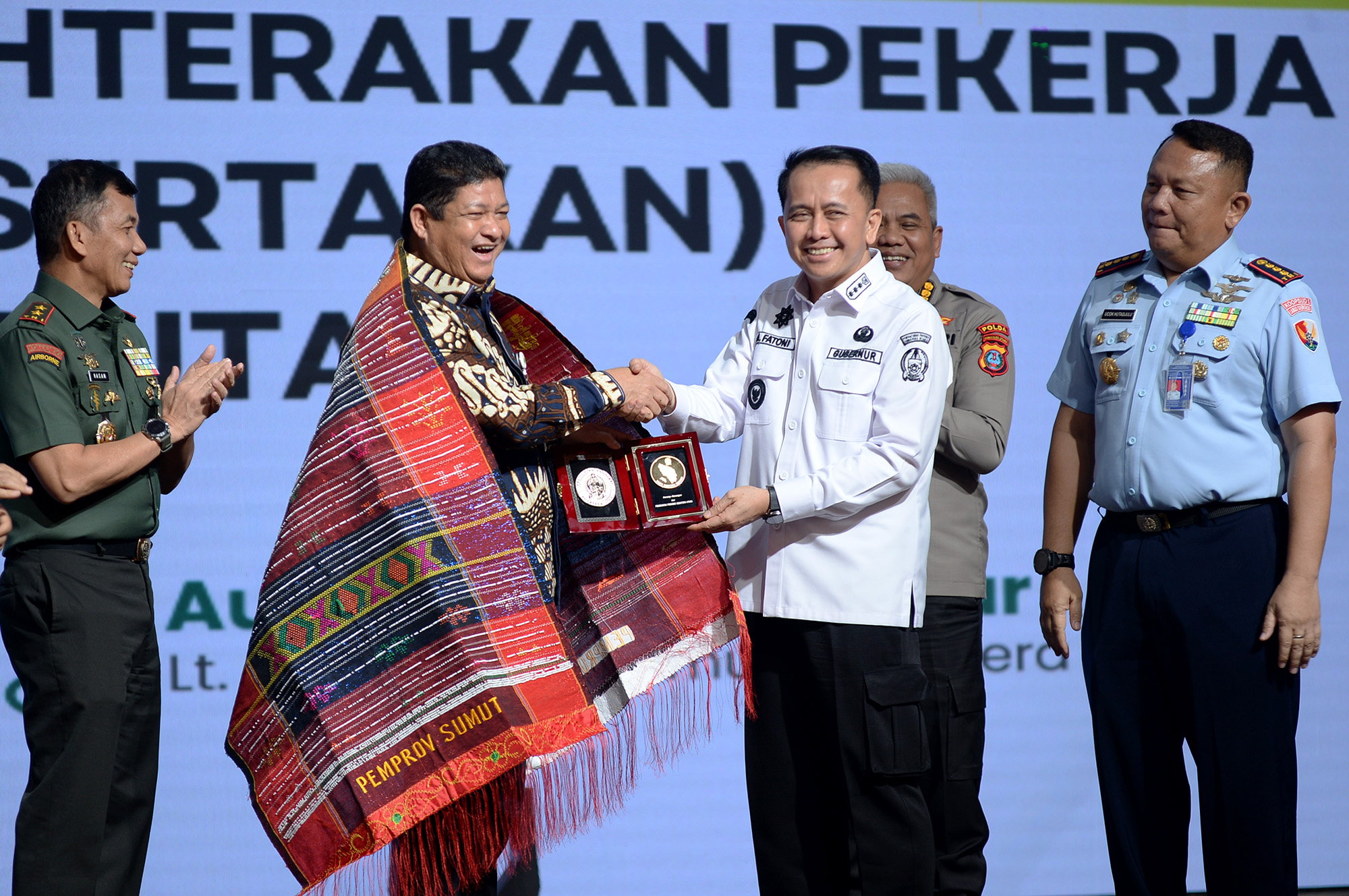 Pada kesempatan ini, Pj Gubernur Sumut Agus Fatoni juga menyerahkan penghargaan pada Kota Medan, Kabupaten Simalungun, Kabupaten Langkat dan Kota Sibolga, atas paritispasi aktifnya dalam perlindungan pekerja rentan di wilayahnya. Tak hanya itu, dirinya juga menyerahkan Kartu BPJS ketenagakerjaan secara simbolis pada perwakilan pekerja rentan.