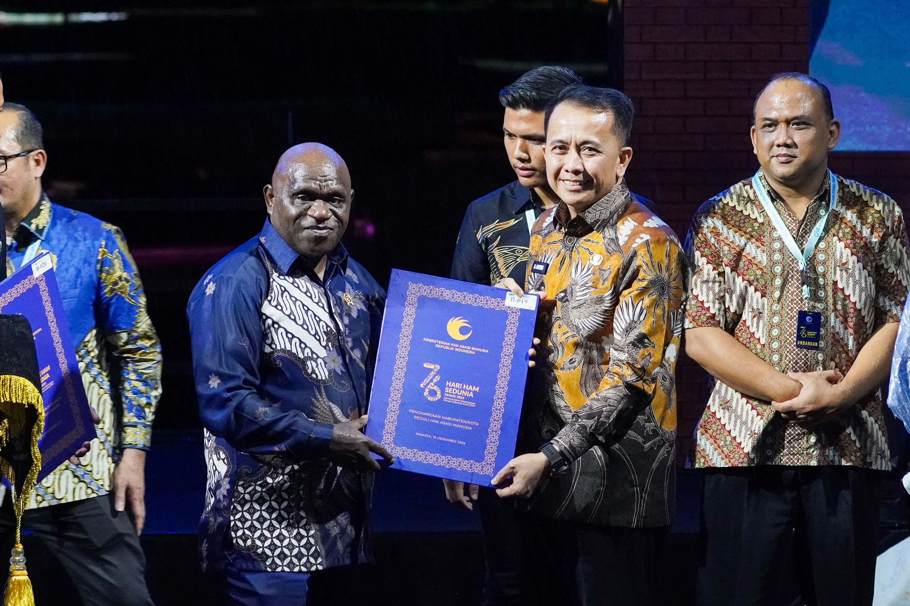 Penjabat (Pj) Gubernur Sumatera Utara (Sumut) Agus Fatoni menerima penghargaan pembina terbaik Hak Asasi Manusia (HAM) dari Kementerian HAM pada Puncak Hari HAM ke-76 di Taman Mini Indonesia Indah, Jakarta, Selasa (10/12/2024). Fatoni diberi penghargaan lantaran sukses membina dan membangun kabupaten/kota peduli HAM.