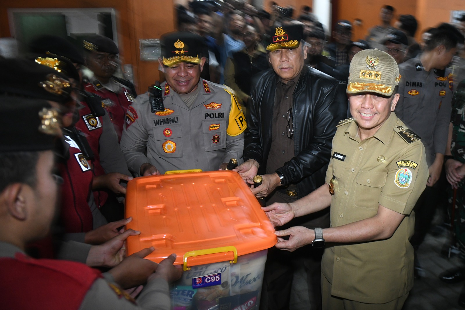 Penjabat (Pj) Gubernur Sumatera Utara (Sumut) Agus Fatoni dan Forkopimda menyerahkan logistik makanan tambahan (extra fooding) kepada petugas KPU dan Bawaslu. Makanan tambahan ini diharapkan bisa menambah kesehatan petugas selama Pilkada Serentak berlangsung.