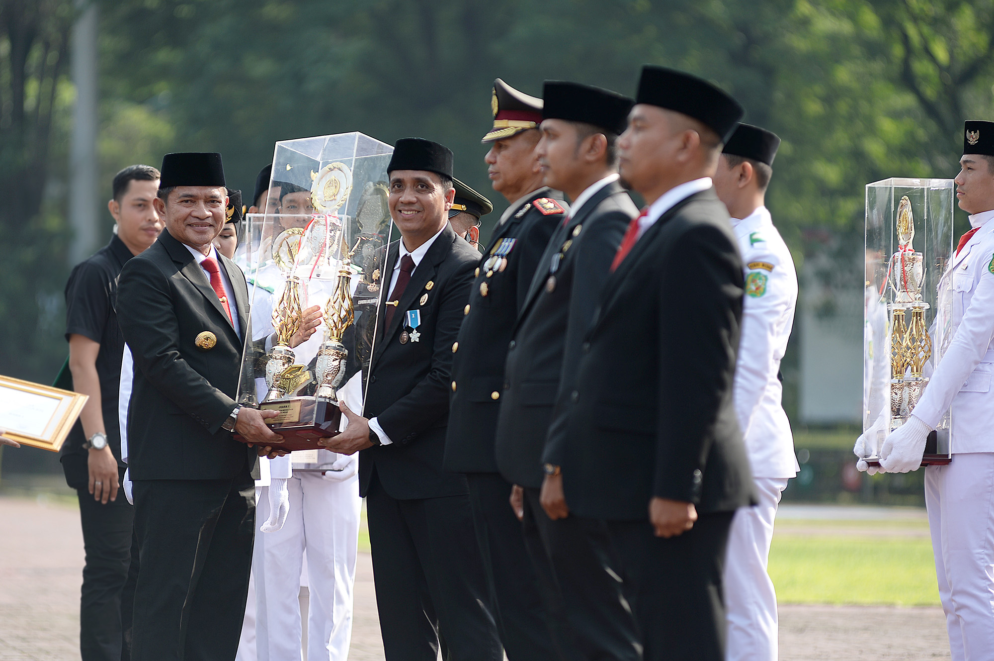 Upacara penyerahan Tunggul Kecamatan Terbaik tingkat Provinsi Sumut yang berlangsung di Lapangan Benteng Medan, Kamis (13/6), turut dihadiri Pj Ketua Tim PKK Sumut Dessy Hassanudin, Sekdaprov Sumut Arief Trinugroho, Walikota Medan Bobby Nasution, Forkopimda Sumut dan Medan, seluruh OPD Sumut dan Medan, para camat, lurah, serta para undangan lainnya.