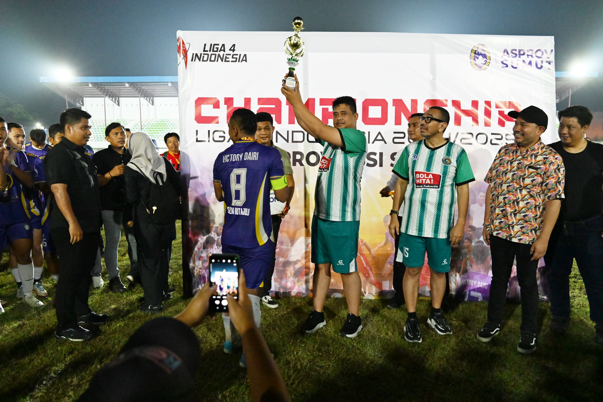 Gubernur Sumatera Utara (Sumut) Bobby Nasution menyerahkan piala juara pertama Liga 4 zona Sumut, pada Klub Victory Dairi usai menang 1-0 dari Persatuan Sepakbola (PS) Kwarta Deliserdang, di Stadion Mini, Jalan Williem Iskandar, Deliserdang, Senin (7/4/2025). Selanjutnya, dua klub tersebut akan berlaga di Liga 4 tingkat nasional.