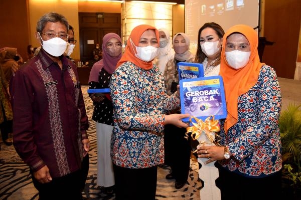 Gerobak baca tersebut secara simbolis diserahkan Nawal Lubis kepada masing-masing Ketua GPMB Kabupaten, di Ruang Lotus Hotel Arya Duta Medan, Kamis (23/6). Turut hadir Kepala Pusat Analisis Perpustakaan dan Pengembangan Budaya Baca Perpusnas RI Adin Bondar, Ketua GPMB Kabupaten Serdangbedagai Rosmaida, Ketua GPMB Tapanuli Selatan Rosalina Dolly, dan Ketua PD GPMB Kabupaten Pakpak Bharat Juniatry.