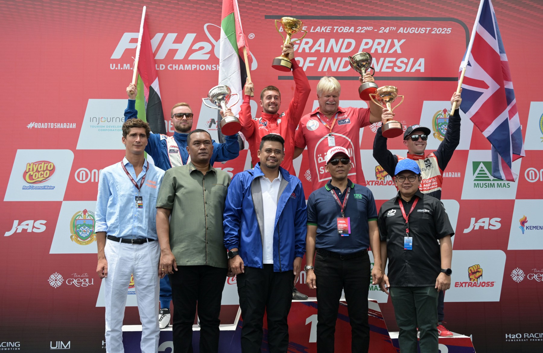 Gubernur Sumatera Utara (Sumut) Bobby Nasution menyerahkan trofi kepada juara F1 Powerboat GP of Indonesia 2025. Penyerahan ini menandai berakhirnya event F1 Powerboat 2025 yang dimulai 22 Agustus 2025 lalu.