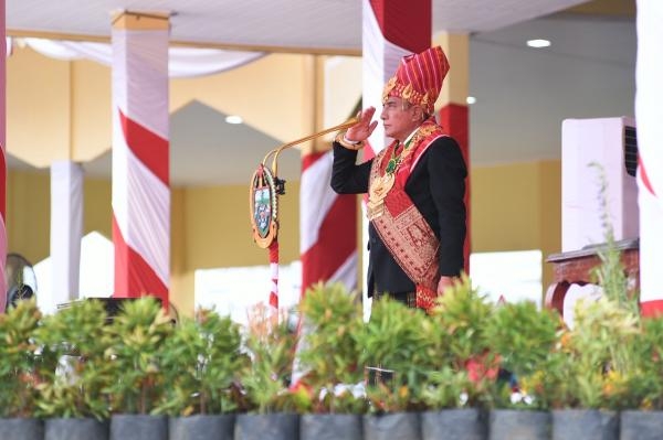 Menjadi Inspektur Upacara pada Peringatan 78 Tahun Kemerdekaan RI 17 Agustus 2023 di Lapangan Astaka Jalan Pancing, Deliserdang, Gubernur Sumatera Utara (Sumut) Edy Rahmayadi mengenakan pakaian adat Karo, bersama sejumlah tokoh yang juga menampilka ciri khas budaya di provinsi ini.