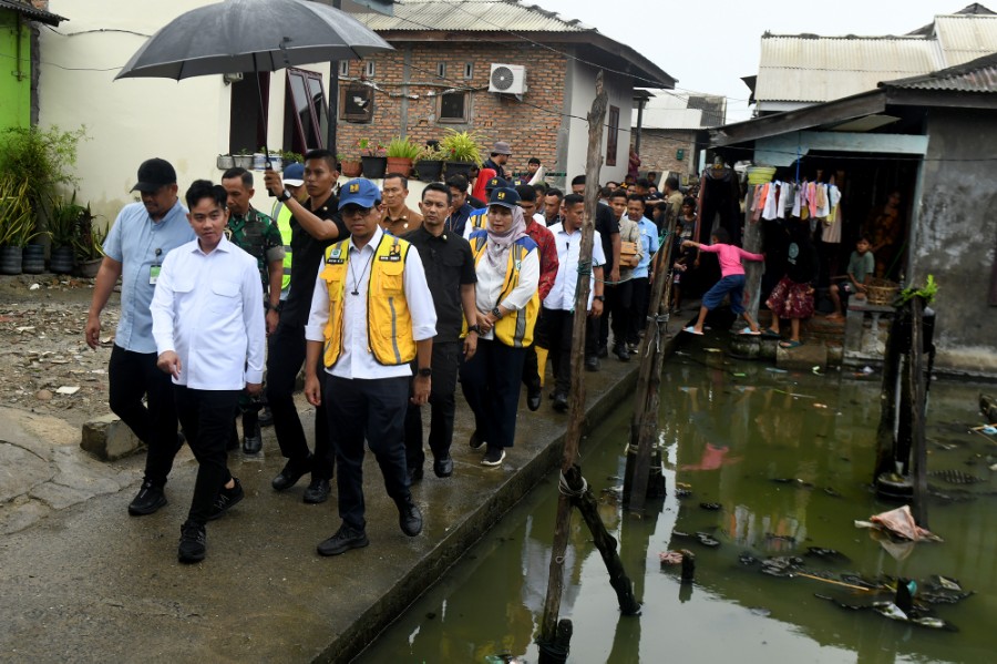 Wakil Presiden (Wapres) RI Gibran Rakabuming Raka meninjau penanganan masyarakat miskin ekstrem di Desa Bahari, Belawan, Kota Medan, Selasa (24/12). Selain itu, Wapres juga memberikan bantuan pangan untuk masyarakat sekitar yang tergolong miskin dan miskin ekstrem.