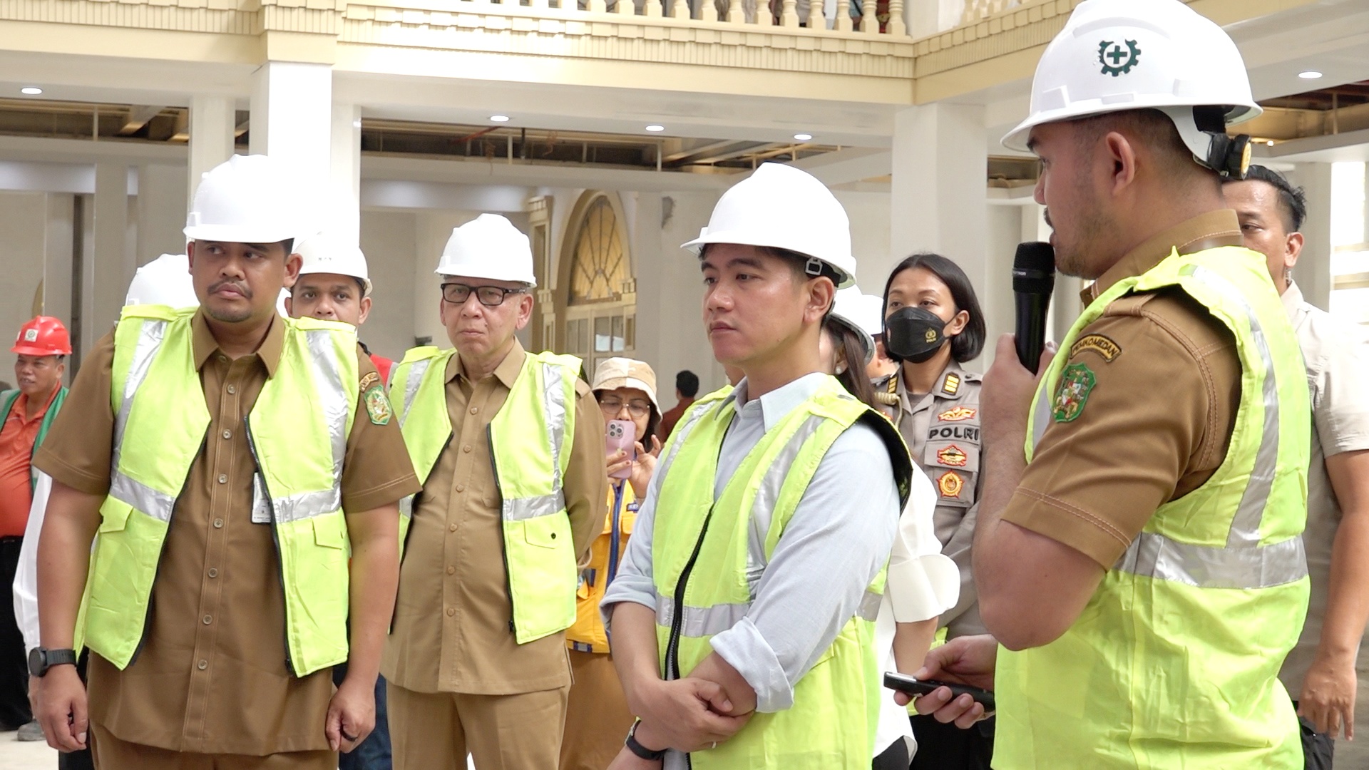 Wakil Presiden (Wapres) RI Gibran Rakabuming Raka didampingi istri Selvi Ananda mengunjungi Gedung Warenhuis di kawasan Kesawan, Jalan Hindu Medan, Senin (23/12/2024). Turut hadir dalam kunjungan tersebut Pj Sekdaprov Sumut Effendy Pohan dan Walikota Medan Muhammad Bobby Nasution.