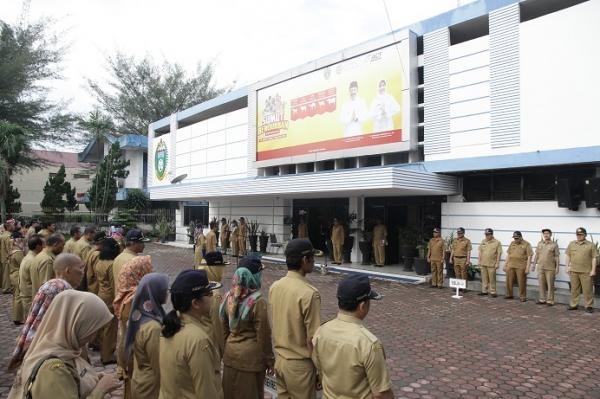 Kepala Dinas Komunikasi dan Informatika Provinsi Sumatera Utara Drs. H. MHD. Fitriyus, SH, MSP memimpin apel pagi sekaligus membacakan pidato pengarahan Gubernur Sumatera Utara (Gubsu) Dr. Ir. H. Tengku Erry Nuradi, M.Si di Halaman Dinas Kominfo Provsu, Senin (11/09).