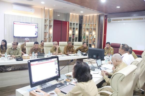 Penjabat (Pj) Gubernur Sumatera (Sumut) Hassanudin mengikuti Rapat Koordinasi (Rakor) tentang inflasi daerah bersama Menteri Dalam Negeri (Mendagri) Tito Karnavian secara virtual dari Ruangan Sumut Smart Province, Lantai 6, Kantor Gubernur Sumut, Jalan Pangeran Diponegoro Nomor 30 Medan, Senin (13/5).